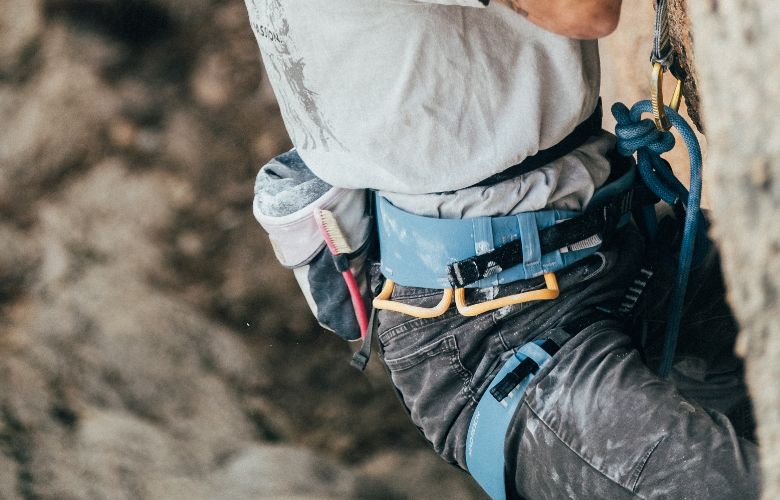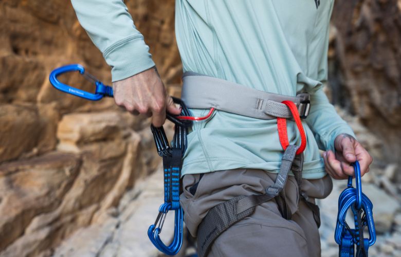 This is where most of your weight is supported in a fall. A wider, well-padded belt distributes force across your hips and is much more comfortable for hanging belays. It should sit on top of your hip bones — not around your waist. If it rides up under your ribs, the harness is too big.