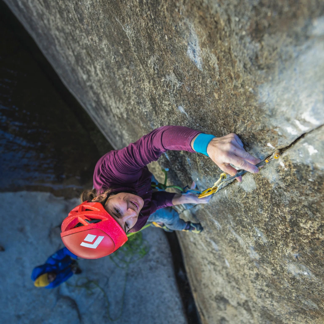 Our superlight, go-anywhere helmet got even lighter. The updated Vapor helmet’s two-piece construction contains a layer of super-light ALUULA composite under the polycarbonate crown for added protection and reduced weight. Molded EPP foam makes up the sides, providing ample venting with the same sleek aesthetic. An ultralight cord fit system makes adjustments and fit easy to fine-tune. Streamlined (and replaceable) headlamp clips are ready for alpine starts or after-dark raps.